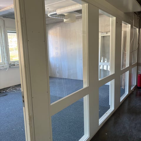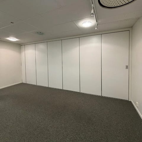 Winab vikvägg i vit färg. Består av flera sammankopplingsbara väggsektioner som kan fällas ihop för att dela av eller öppna upp ett rum. Panelerna löper i takskena och har infällda handtag i metall. Passar för exempelvis kontor, konferensrum eller andra lokaler där flexibel rumsindelning önskas.