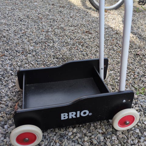 BRIO lära‑gå‑vagn i rött trä med vit metallbygel. Vagnen har fyra hjul och en öppen lastyta som rymmer leksaker eller andra småsaker. Passar för små barn som håller på att lära sig gå och behöver stöd vid förflyttning inomhus på plana golvytor.