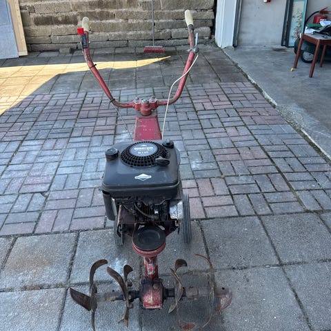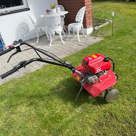 Bensindriven jordfräs med 4 hk motor. Maskinen har frammonterade fräsknivar och två hjul bak för förflyttning. Passar för bearbetning av jord i trädgårdsland och mindre odlingsytor. Drivs med bensin och startas med snörstart. Reglage och handtag är placerade på styret för styrning och kontroll under arbete.