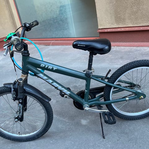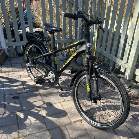 Crescent barncykel med 20" hjul. Cykeln har blå ram med gula detaljer, fotbroms bak och handbroms fram. Utrustad med stänkskärmar fram och bak samt kedjeskydd. Passar barn som behöver en mindre cykel med 20-tums hjul för vardagscykling och fritidsbruk.