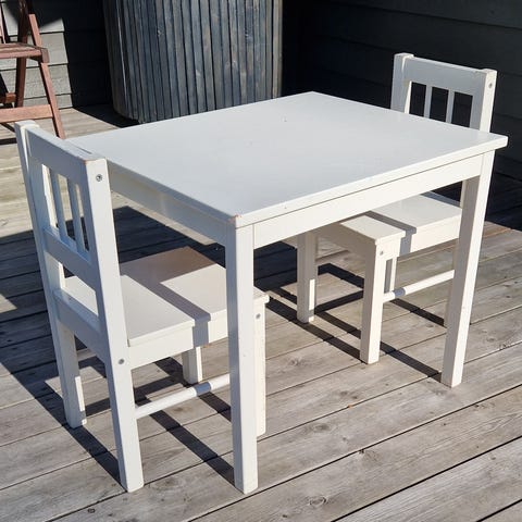 Bord Höjd 56cm, djup 31, bredd 68, stol H 67,d 31,b31 och bänk h62, d 42, b52. Fint skick och passar både kille och tjej.
