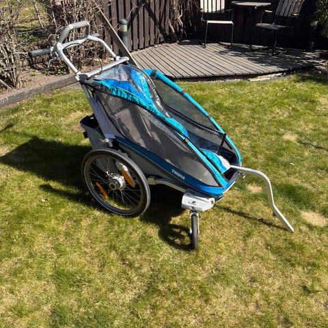 Cykelvagn Thule Cross 2. Praktiskt cykelvagn för 2 barn. Tyg, insektsnät, hjul m.m. i mycket gott skick. Sätena går att fälla separat. Stort förvaringsfack baktill på vagnen. Cykelvagnen har förvarats i garage i rök- och djurfritt hem. Sprinten till framhjulen är lite rostig men det är inget som påverkar funktionen.