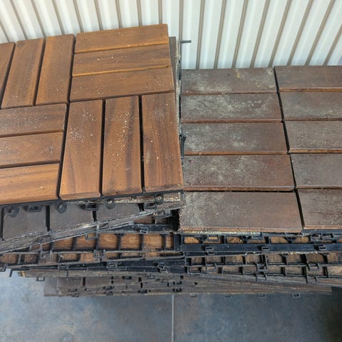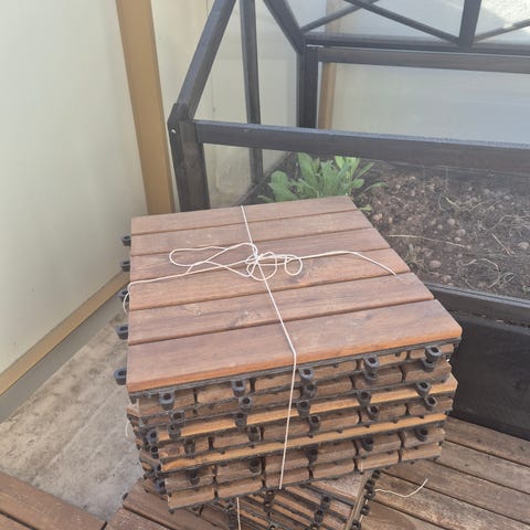 Trallgolv i trä bestående av kvadratiska trallplattor för uteplats eller balkong. Plattorna är lagda i mönster med diagonala och raka brädor. Måttband på bilderna visar ungefärliga längder på brädor och sektioner, vilket kan användas för att uppskatta storleken på ytan. Golvet är avsett för användning utomhus, exempelvis på balkong, altan eller annan uteplats. Trätrall till balkong/uteplats – ca 9 m²