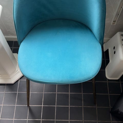 4x bekväma stolar med grå sammetsklädsel och svarta metallben. Ryggstödet har ett quiltat mönster.
