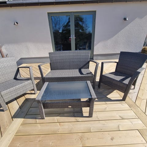 Fyra fåtöljer och ett bord. Två år gammalt. Nypris 28 000kr säljes för 16 000kr