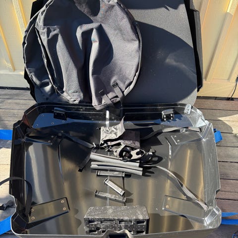 Cykeltransportväska i hård plast för säker transport av cykel. Väskan är svart med blåa förstärkningar och spännband. Den har hjul i botten för enklare förflyttning samt metallspännen upptill för stängning. Passar för transport och förvaring av cykel vid resor eller längre transporter.