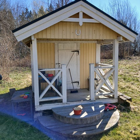 Lekstuga med plåttak. Träet i gott skick men skrapning och målning behövs. Plannja plåttak i utmärkt skick. Fri mot bortfraktning.