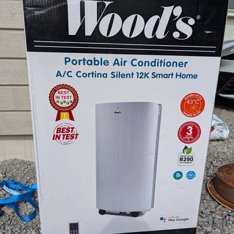 Wood’s AC Cortina Silent 12K portabel luftkonditionering i vit färg. Modellen har en kylkapacitet på 3,5 kW och använder köldmediet R290. Strömförsörjning 220–240V/50Hz. Enheten har flera fläkthastigheter och inställningar som styrs via kontrollpanel på ovansidan eller medföljande fjärrkontroll. Avsedd för inomhusbruk för att kyla rum i bostad eller kontor upp till 35kvm. Maskinen är försedd med hjul för att kunna flyttas mellan olika rum. På baksidan finns teknisk informationsetikett med uppgifter om effekt, luftflöde, ljudnivå och dimensioner. Kondensation samlas på baksidan av maskinen.