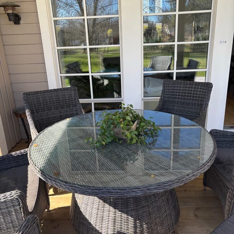 Trädgårdsgrupp bestående av ett runt bord med glasskiva och två stolar med armstöd. Stolarna har beige sitt- och ryggdynor och ett underrede i mörk metall. Bordet har metallstativ och rund, genomskinlig glasskiva. Passar för uteplats, altan eller balkong som sittgrupp för två personer.