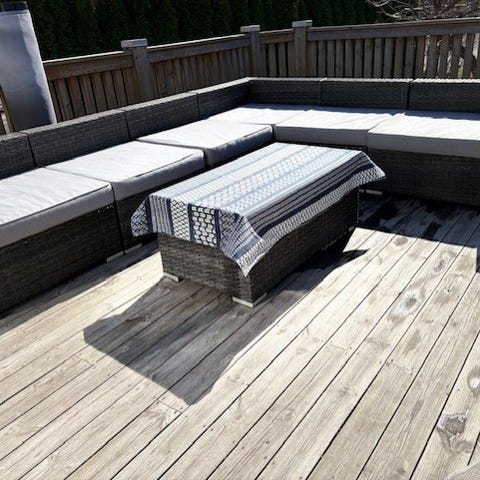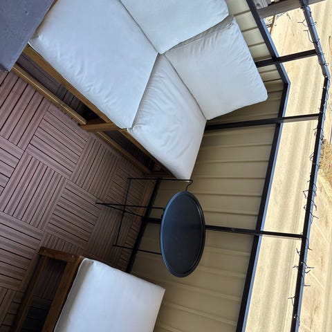 Hörnbänk med vita sittdynor för uteplats eller balkong. Består av flera sittdelar som bildar en hörnsoffa. Lämplig för placering mot vägg eller räcke på balkong, uteplats eller inglasad veranda. Köparen hämtar.