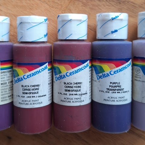 Delta Ceramcoat akrylfärg i flera blå nyanser. Färgen är vattenbaserad akrylfärg lämplig för målning på olika underlag som trä, papper och vissa textilier. Flaskorna på bilden visar olika blå kulörer, bland annat ljusblå och mörkare blå toner. Passar för hobbyprojekt, dekorationer och annan detaljmålning där akrylfärg önskas.