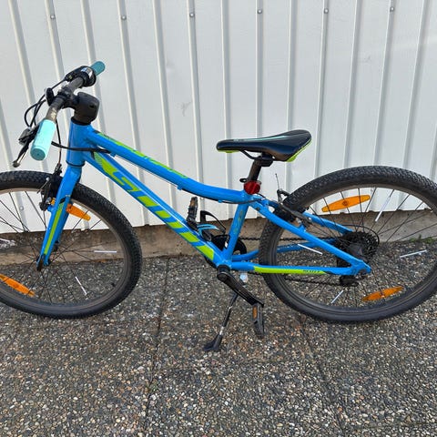Barncykel med 20" hjul i blå färg. Cykeln har lätt ram, handbromsar fram och bak samt växlar bak. Utrustad med stänkskärmar och v-bromsar. Min son använde den när han var 7 år. Alltid förvarad inomhus. Fint skick.