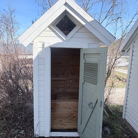 Ett väl använt, väl fungerande förråd av plåt, med dubbla skjutdörrar, som skall bytas ut. Är inte demonterat ännu och finns på Rådmansö.