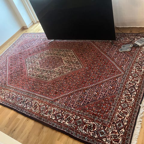 Bra använt skick enligt bilder, kan finnas någon liten svag fläck men inget som syns nämnvärt. På vissa ställen är den mer använd än andra. Kan tvättas på 30 grader ifall man vill fräscha upp den.