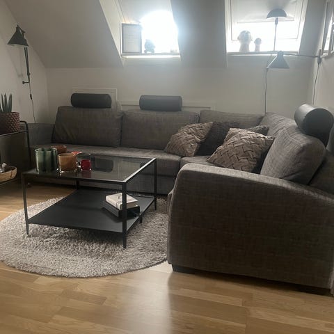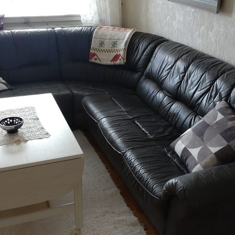 Stor hörnsoffa i skinn/skai. Skinn på sittytor, ryggstöd och armstöd. Skai på övriga ytor. Skinnytorna är nästan felfria. Övriga ytor är kattkloade, men dessa ytor är inte så synliga. Lite lagningslappar på kloade ytor.