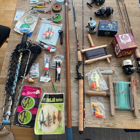 Fiskeset med flera fiskespön och tillhörande beteslådor. På bilderna syns ett flertal spön av olika längder med rullar monterade, samt flera plastlådor med drag, beten, krokar och tillbehör. Utrustningen lämpar sig för allroundfiske i sötvatten eller kustnära vatten. Exakta märken, längder och material på spön och rullar framgår inte av bilderna och kan kontrolleras vid intresse eller köp.