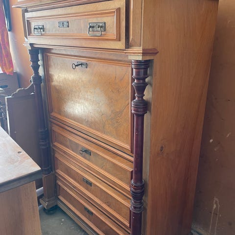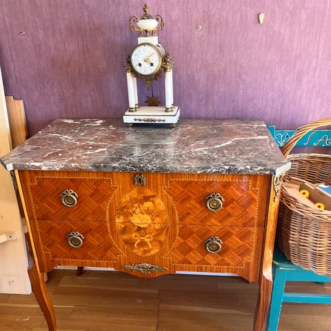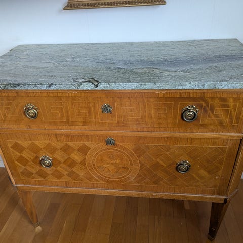 Byrå med svängda sidor och marmorskiva. Möbeln har tre lådor med dekorativa beslag i metall. Front och sidor är utförda i trä med intarsialiknande mönster i bruna toner. Ovanpå finns en marmorskiva i mönstrad sten. Passar som förvaringsmöbel i exempelvis hall, vardagsrum eller sovrum.