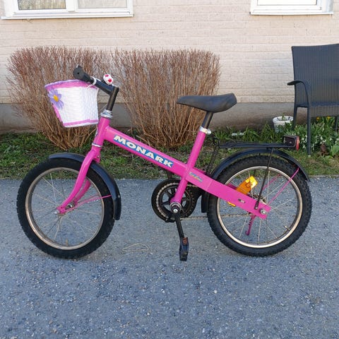Crescent barncykel med 16" hjul i lila färg. Utrustad med framkorg, pakethållare bak. Cykeln har fotbroms bak och handbroms fram. Anpassad för barn som passar en cykel med 16-tums hjul 4-6 år. Kan mötas upp i Herrljunga centrum.