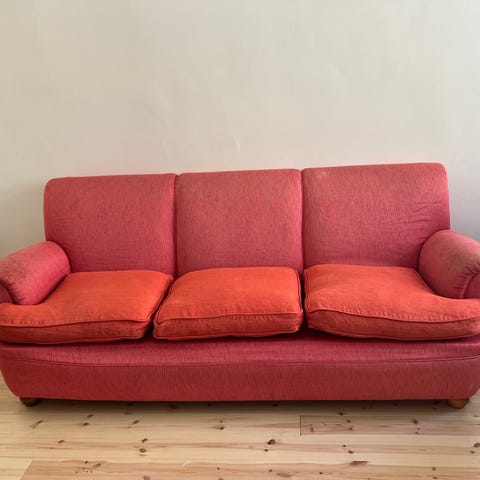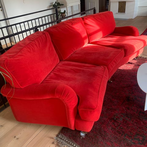 Skön, röd Howardsoffa för tre till fyra personer säljes. Den är ca 15 år gammal och i bra skick om än något solblekt.