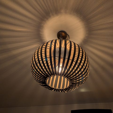 Klassisk italiensk Space Age-lampa från 1970-talet i högkvalitativt akrylglas (Vetro Acrilico). Enligt originalmärkningen är den tillverkad i polymetylmetakrylat, ett material som behåller sin klarhet, lyster och transparens utan att gulna med tiden. Svart kupol med en transparent, mönstrad kant. Diameter 66 cm. Höjd 30 cm. Kabellängd 1 m. Bra skick med endast en smärre repa (se sista bilden).