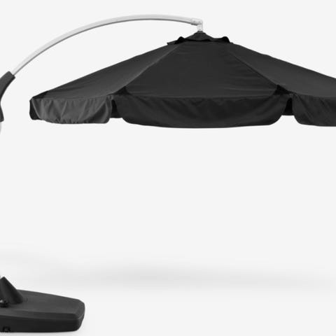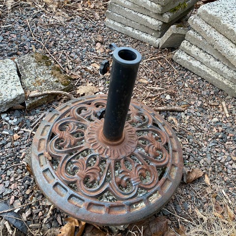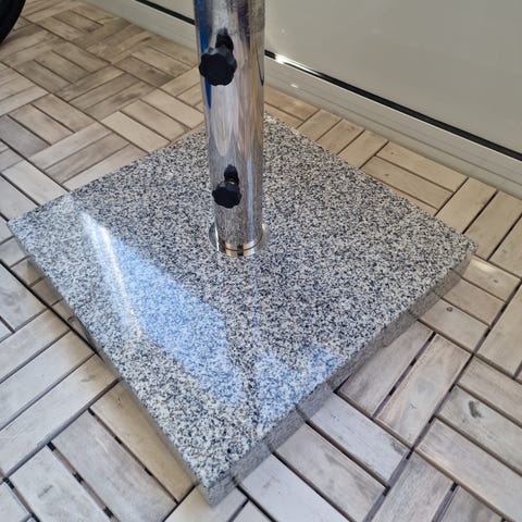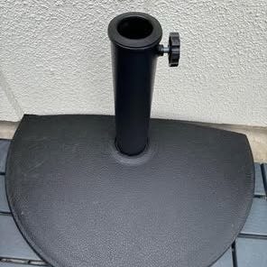 Parasollfot i svart metall med dekorativt mönstrad rund bas. Stativröret har skruv för att fästa parasollstolpen. Lämplig för användning på uteplats, balkong eller trädgård tillsammans med passande parasollstorlek. Höjd 47cm, diameter rör 50 mm. Vikt ca 20 kilo.