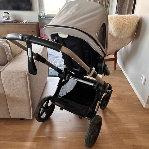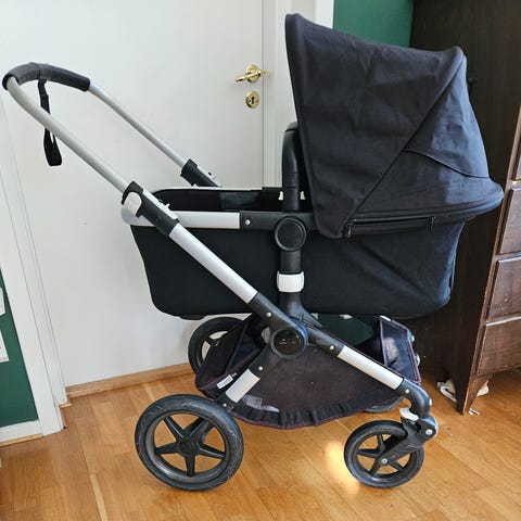Säljer en smidig och pålitlig Bugaboo barnvagn i svart textil. Perfekt för både stadspromenader och varierat underlag tack vare stora bakhjul och svängbara framhjul.