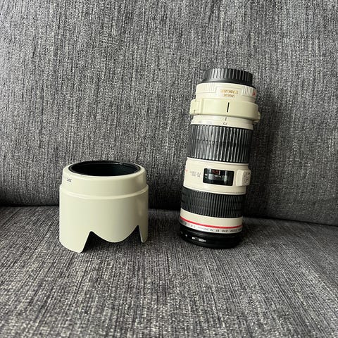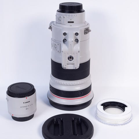 Canon EF 300mm f/2.8L IS USM teleobjektiv i vit färg.