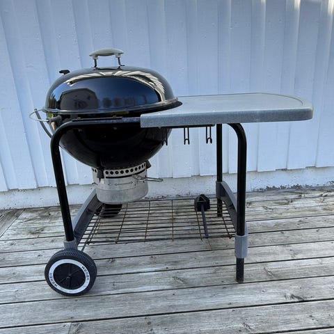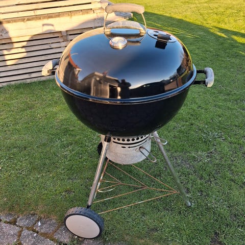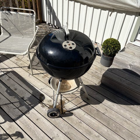 Weber klotgrill för kol i svart utförande. Grillen har lock med ventil för reglering av luftflöde och temperatur, samt handtag på lock och sidor för enkel hantering. Utrustad med grillgaller i metall, askuppsamlare under grillen och benställning med två hjul för att kunna flyttas på altan eller i trädgård. Passar för grillning utomhus, exempelvis på uteplats eller i trädgård.