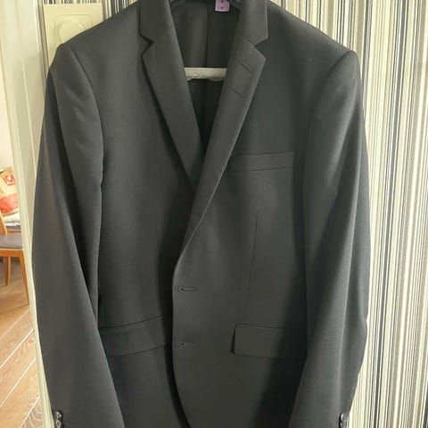 Mörkblå smokingkavaj och smokingbyxa,, gördel och fluga i samma färg. Smokingskjorta som tillbud