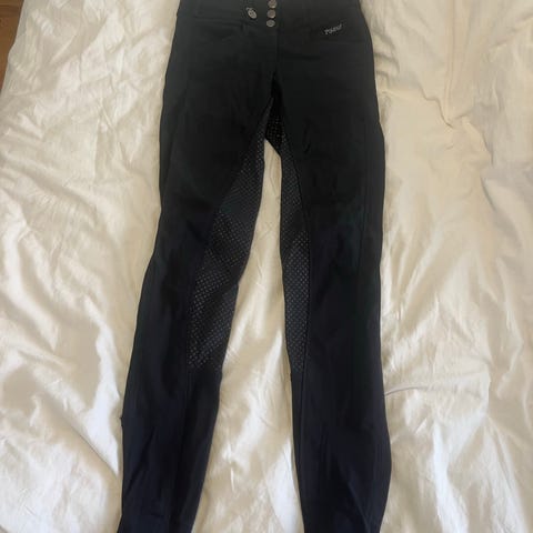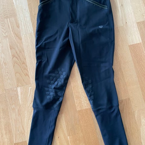 Svarta helskodda ridbyxor i stretchigt material från Maya Delorez i modellen Performance Breeches .Helskoningen ger extra grepp i sadeln och byxorna har smal passform med långa ben. Passar för ridning och stallarbete. Dem är i storlek xs och använda ett fåtal gången så skicket är nytt. Nypris är 1200 kr