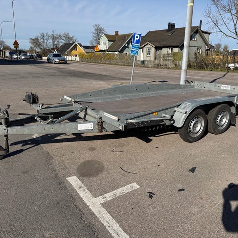 Biltransportkärra med elvinsch och dubbelaxel. Flak med slät yta anpassat för transport av bil eller andra fordon. Elvinsch med stålvajer monterad framtill på kärran för att underlätta lastning och lossning. Dubbelaxlad konstruktion med flera hjul för stabilitet vid körning. Däck med mönsterdjup enligt bild. Passar för transport av personbil, mindre maskiner eller annat gods som får plats på flaket.