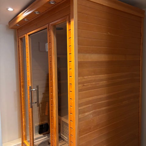 Infraröd bastu i hörnmodell i trä. Bastun har sittplatser längs två väggar och ryggstöd i trä. Väggarna är utrustade med infravärmepaneler och det finns glasdörr framtill. Invändigt finns trätrall på golvet och panelklädda väggar. Bastun är avsedd för inomhusbruk och rymmer flera personer samtidigt beroende på placering och sittupplägg.