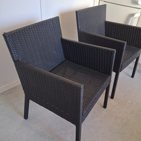 Fyra stycken utomhusfåtöljer i mörkgrå konstrotting. Har endast stått inomhus på inglasad altan. Fint skick. Dynor inköpta förra året ingår. Dynorna är ljusa, men lite melerade i grått. Nypris 1200 kr/st.