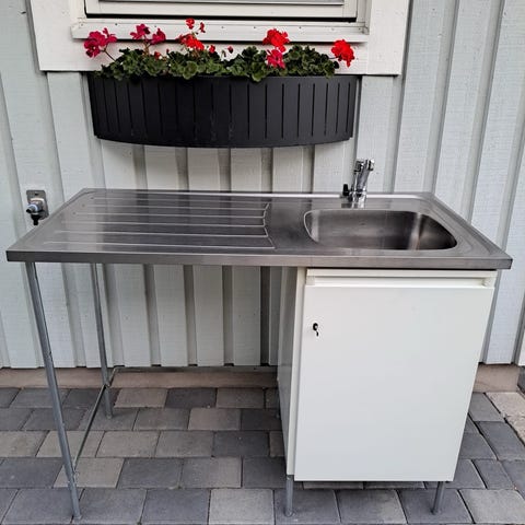 Köksbänk med diskho och blandare. Bänken har vit stomme och luckor samt bänkskiva i träutseende. Inbyggd rostfri diskho med enkelkran. Underskåp med dörrar och låda ger förvaringsutrymme för köksredskap och rengöringsmedel. Mått enligt ritning: cirka 120 cm bred, 61 cm djup och 91 cm hög. Passar som enkel kökslösning i exempelvis mindre kök, pentry eller tvättstuga.