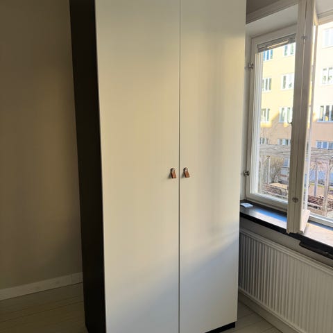 2 hyllplan, 1 stång, 3 korgar ingår. Spegel på insidan av vänster dörr.