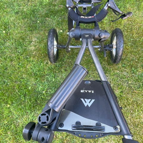 Europa golfvagn trehjuling i svart färg. Vagnen har tre hjul och ett stabilt chassi anpassat för att transportera en golfbag runt banan. Handtaget har integrerad panel med hållare och fästen för tillbehör.
