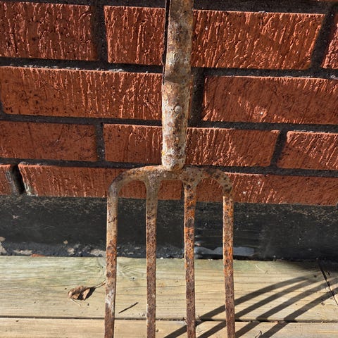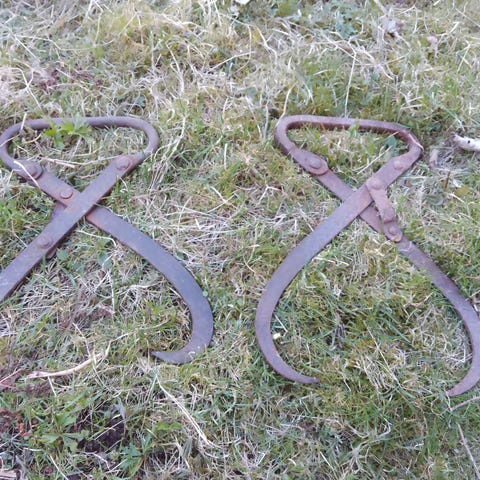 Gammal timmertång i järn i rostbrun färg. Verktyget har två böjda griparmar fästa i en kraftig metallram med bultar. Avsedd för lyft och hantering av stockar eller annat timmer. Passar som funktionellt verktyg eller som dekorativt föremål i exempelvis verkstad, ladugård eller trädgårdsmiljö.Hela 87cm ! Tung!