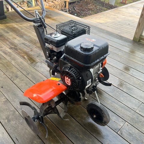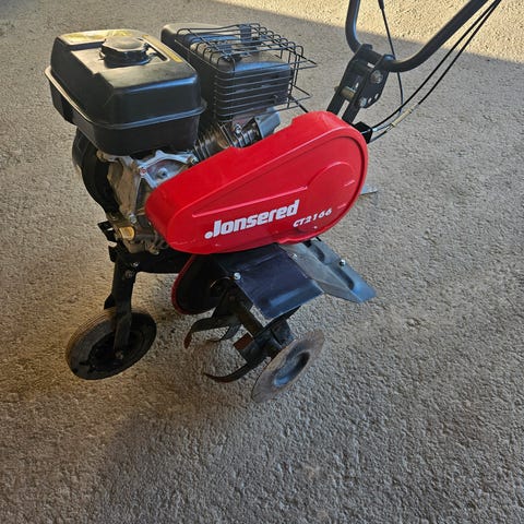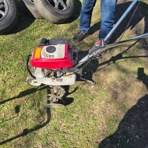 Denna jordfräs går som tåget! Sparsamt använd, startar på ett eller två drag och kör hela tiden utan att stanna. Fungerar utmärkt men då vi inte längre ska odla potatis behöver vi den inte mer.