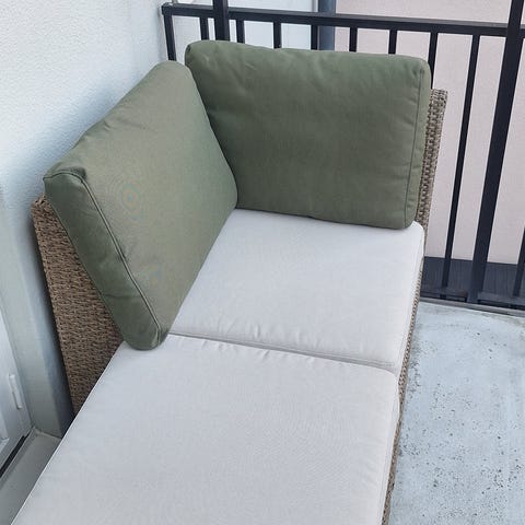 Modulär loungesoffa för uteplats i grå konstrotting. Består av flera separata moduler som kan ställas ihop till en större liggyta eller användas som enskilda sitt- och fotpallar. Dynor och ryggkuddar i matchande grå färg ingår. Passar för användning på balkong, altan eller trädgård som flexibel sitt- och viloplats utomhus.