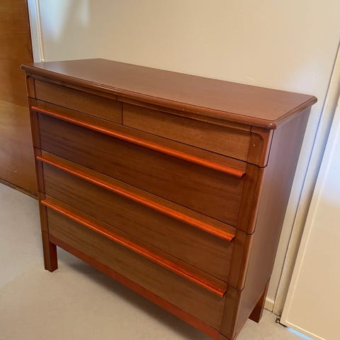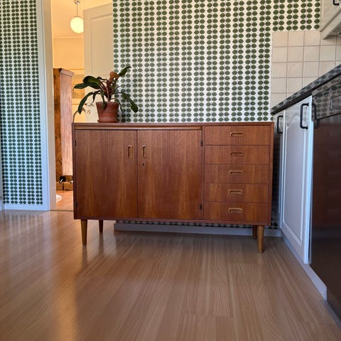 Säljer ett fint serveringsskåp i teakfan’er med klassisk retrodesign från 1950–60-talet. Skåpet har en praktisk nedfällbar klaff som fungerar perfekt som barskåp eller serveringsyta.