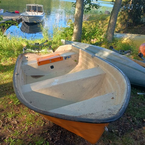 Stabil och lättmanövrerad kanadensare, ca 1 m bred och ca 4,90 lång. Förberedd att sätta fast mindre motor. 1 st. kanot trailer, 2 st. dubbel paddlar. flytvästar 1 st. 10-15 kg, 1 st. 30-40 kg, 1 st. 10-25 kg, alla dessa äldre. Marine flytvästar, 70-90 kg använd 2 gånger, 70-90 kg aldrig använd, 1 st. 50-70 kg använd 2 gånger, 1 st. 30-50 kg använd 2 gånger.