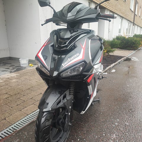 Viarelli Matador moped i flerfärgat utförande. Fordonet är avställt enligt fordonsuppgifterna. Mätarställningen visar cirka 3 283 km. Utrustad med dubbla strålkastare fram, backspeglar och bakre pakethållare. Instrumentpanelen har analog hastighetsmätare upp till 80 km/h. Lämplig för kortare pendlingssträckor och körning i tätort. Registreringsnummer framgår på bild, vilket underlättar kontroll av tekniska data och fordonsstatus hos Transportstyrelsen.