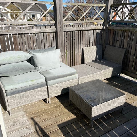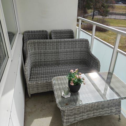 Hörngrupp utemöbler i grå konstrotting. Består av flera modulära sittdelar som kan ställas som hörnsoffa samt ett lågt bord med glasskiva. Passar för uteplats, altan eller balkong. Konstrottingen är flätad och anpassad för utomhusbruk. Fina dynor ingår!