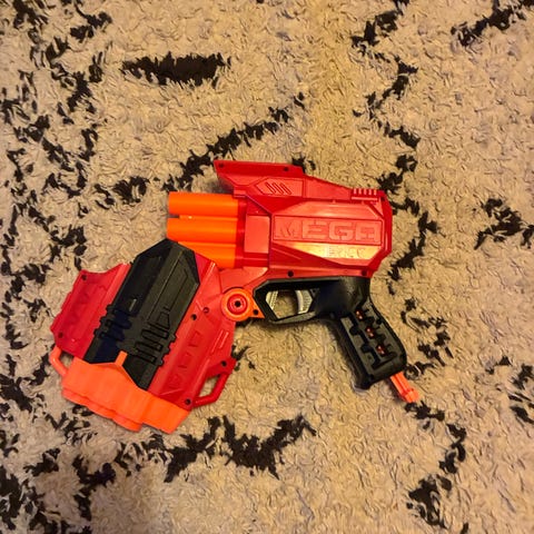 Nerf Mega Cycloneshock leksakspistol i röd färg. Modellen har roterande trumma för pilar och är utformad som en handhållen blaster. Passar för lek med skumpilar inomhus och utomhus. Används med kompatibla Nerf Mega-pilar (ingår inte om det inte anges separat i annonsen).