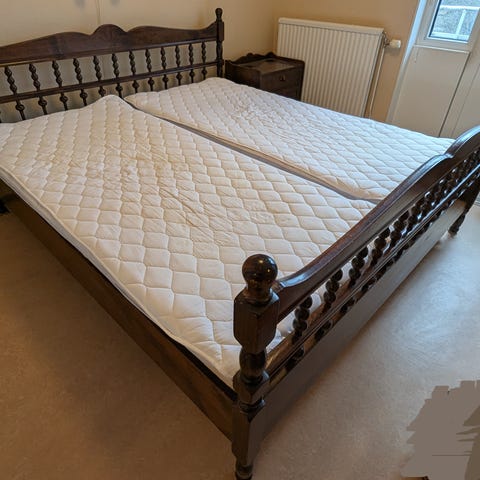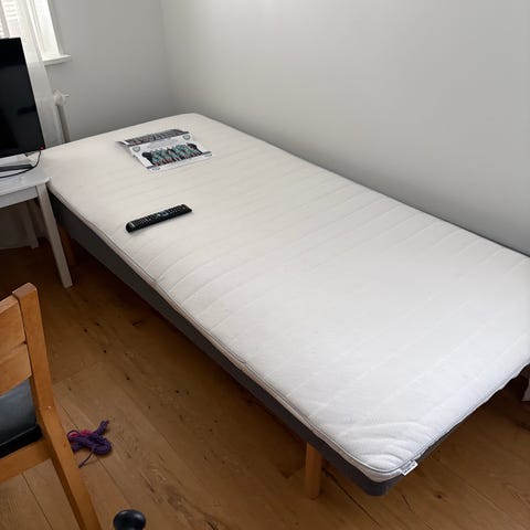 Sängstomme, madrass, byrå, och sminkbord bortskänkes. Isärskruvning och bärhjälp ingår ej.