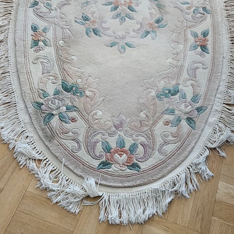 Persiskt rund matta i beige och ljusa toner med mönstrad mitt och bård runt om. Mattan har fransar längs ytterkanten. Passar till exempel i vardagsrum eller under soffbord. Materialet är ej specificerat men mattan är vävd och avsedd för inomhusbruk.