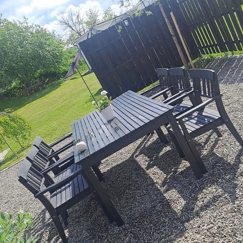 Royal Teak of Scandinavia, matgrupp med bord och 4 stolar. Allting är helt, träet har grånat så antingen låter man det vara så eller så ger man möblerna lite kärlek. Både bord och stolar är ihopfällbar. Bord 120 x70 cm