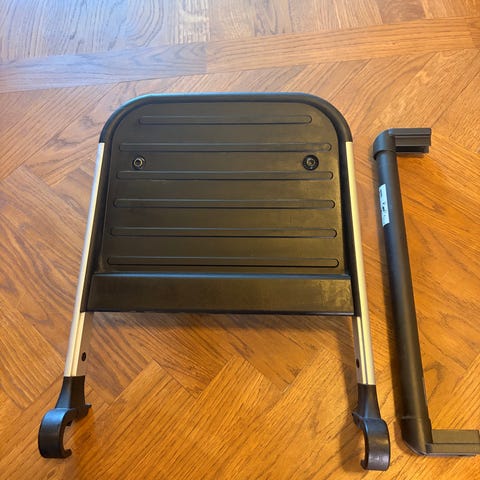 Bugaboo ståbräda till barnvagn i svart med två hjul framtill. Ståbrädan är avsedd för ett större barn som kan stå upp eller sitta bakom vagnen under promenader.