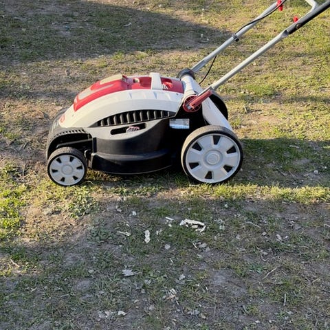 En äldre handgräsklippare som kan behöva lite kärlek, men som ändå fungerar att klippa gräs med.
