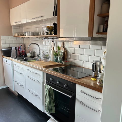 Furuluckor lackade 2016 på lackfirma. Bänkskiva från samma år, Ikea. Diskho i svart komposit från 2021, då den första gick sönder och naturligtvis hade utgått, liten åverkan på bänkskivan efter det.